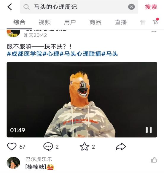 3月至5月份,团队建设了以“马头的心理周记”为题的短视频账号,拍摄了面向广大青年群众的心理宣传视频,在宣传视频中,以处处可见的生活剧情为主,讲解为辅,展现了生活中蕴藏的心理小知识。视频人设新奇,剧情有趣,内容丰富,一上线便是获得了广大员工的一致好评。通过心理短视频的宣传,同学们初步了解到了与生活现象相关的许多心理知识。