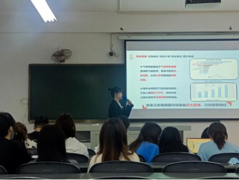 各小组结合市场需求和实际,勇于探索。有的同学针对现实生活中老年人用药不便问题,计划打造一款“知药”APP,方便老年人了解家中常备药;有的同学将非遗中的刺绣、蜡染结合,希望在创新创业中助力乡村振兴;还有的同学改进便携式吸痰器,以便人们在多种场合使用。各组选手展示风格各异,有的生动活泼,有的严谨干练,可谓各显风采。