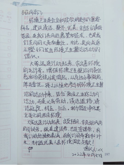 卫生与我们的生活息息相关,它关乎我们的生命健康。在疫情再次严重的情况下,我们更要重视自己的卫生习惯。此次活动形式丰富多样,同学们不仅从自身出发,带领寝室同学进行卫生大扫除;还绘出了一幅幅生动的世卫宣传海报,写出了一张张整洁的世卫宣传倡议书,向身边的同学朋友们宣传卫生小知识。